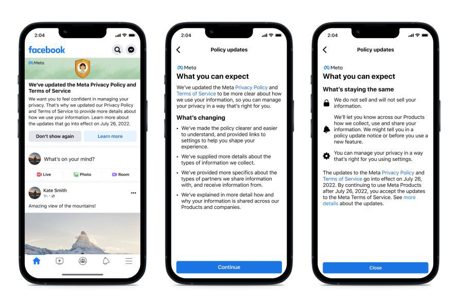 Η Meta τονίζει ότι η ενημερωμένη Πολιτική Απορρήτου δεν εισάγει νέους τρόπους συλλογής, χρήσης ή κοινής χρήσης δεδομένων χρηστών από την εταιρεία. Μάλλον απλοποιεί τη διατύπωση και παρέχει πιο λεπτομερείς και σαφέστερες εξηγήσεις για την πολιτική και τις διάφορες πρακτικές δεδομένων. Η νέα Πολιτική Απορρήτου, παλαιότερα γνωστή ως Πολιτική Δεδομένων, θα τεθεί σε ισχύ στις 26 Ιουλίου. Καλύπτει το Facebook, το Messenger, το Instagram και άλλα προϊόντα Meta, αλλά δεν περιλαμβάνει το WhatsApp, το Workplace, τα Free Basics και το Messenger Kids. Η εταιρεία λέει ότι έχει αρχίσει να στέλνει ειδοποιήσεις στους χρήστες σχετικά με τη νέα πολιτική. Οι χρήστες μπορούν να κάνουν κλικ στην ειδοποίηση για να ελέγξουν τις αλλαγές και να λάβουν περισσότερες λεπτομέρειες, αν και δεν χρειάζεται απαραίτητα να ενεργήσουν σε αυτές τις ειδοποιήσεις και να επιλέξουν να τις αγνοήσουν.